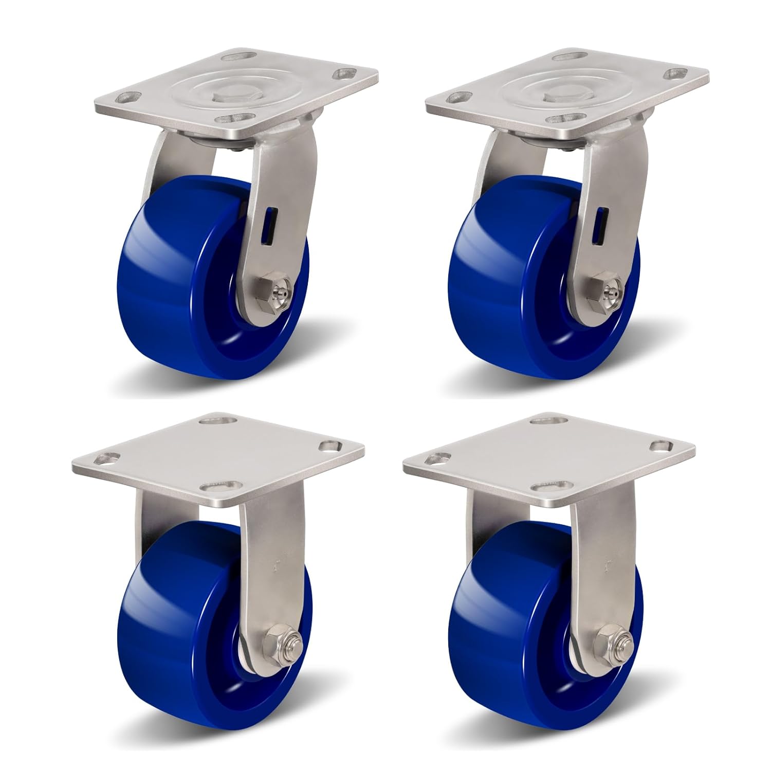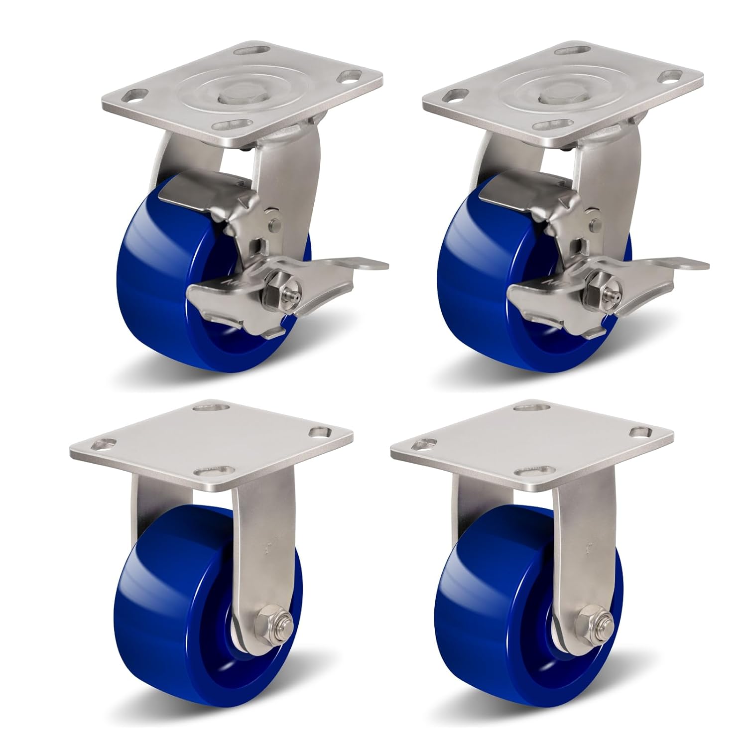 Our high-quality stainless steel casters are designed to withstand demanding environments. Built with corrosion-resistant and rust-proof stainless steel, these casters deliver long-lasting durability, even in high humidity, chemical, and extreme temperature conditions. Equipped with solid blue polyurethane wheels, these casters are perfect for environments frequently exposed to water. They can withstand temperatures ranging from -40°F to +180°F, making them ideal for healthcare, food service, manufacturing, and laboratory settings.
