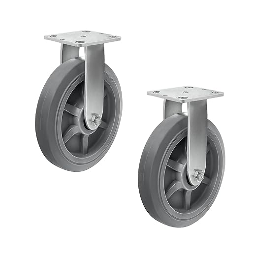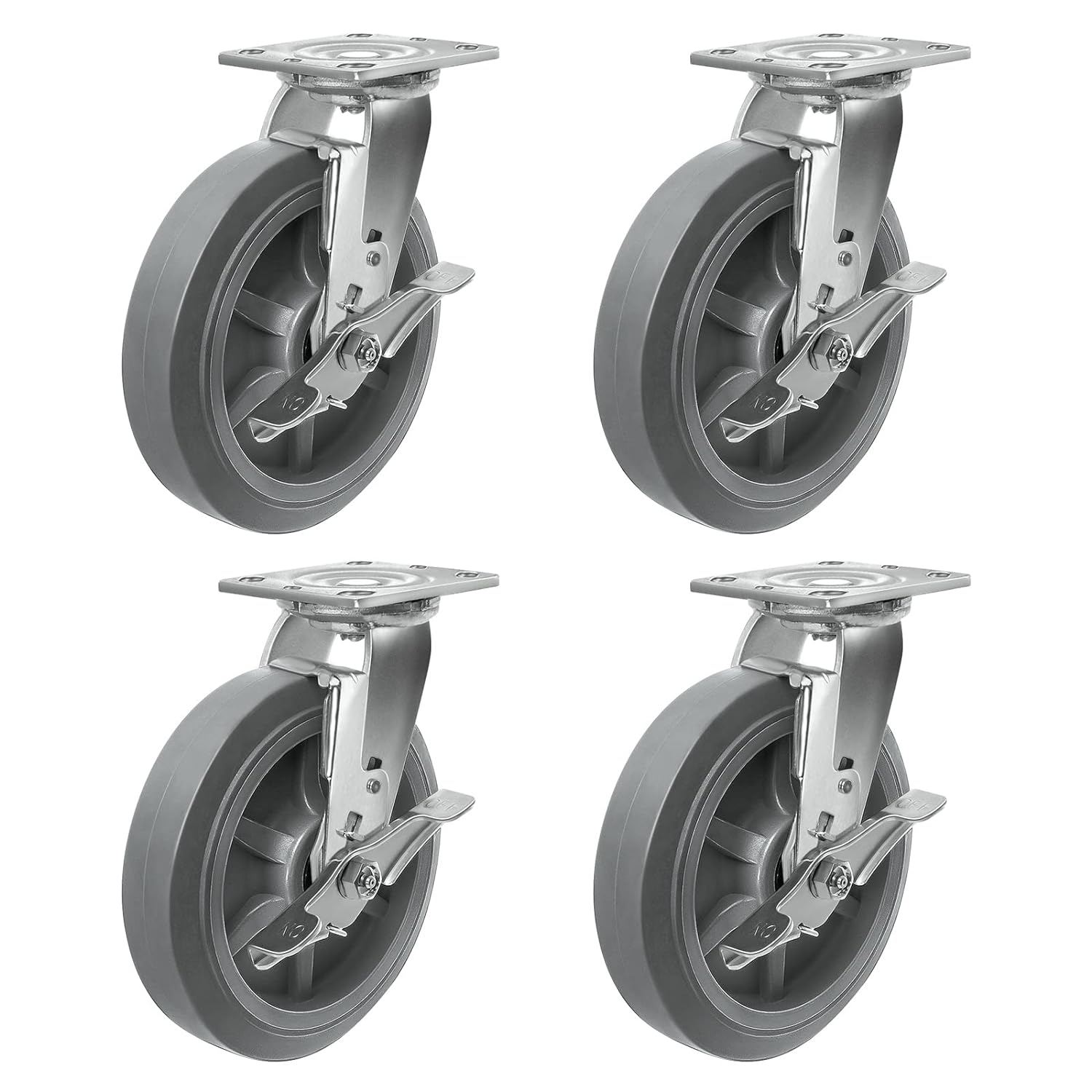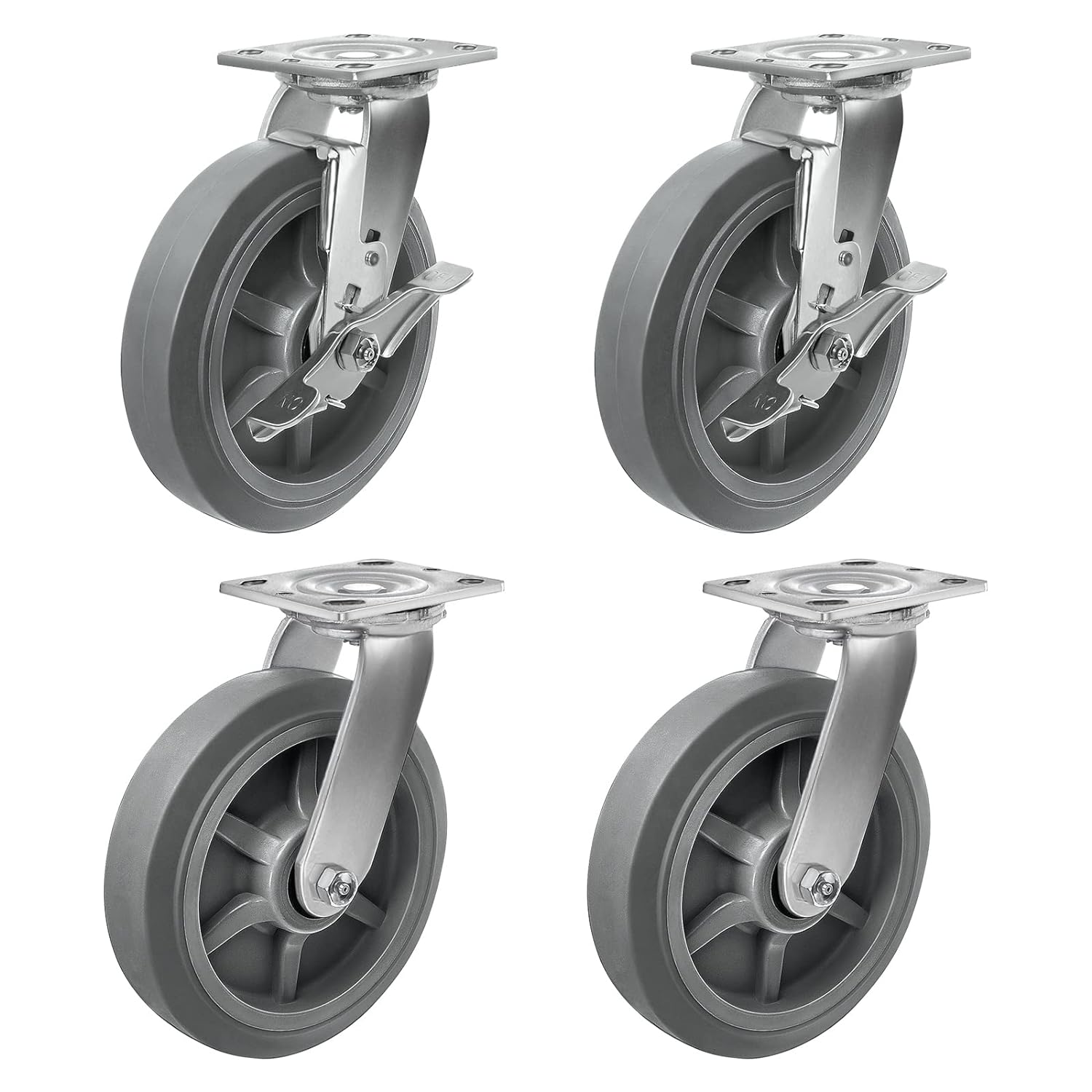 • 8" Rubber Casters: 2" width, 4x4-1/2 top plate, 9-1/2" total height, supports up to 1100 lbs per caster (4400 lbs for set of 4).