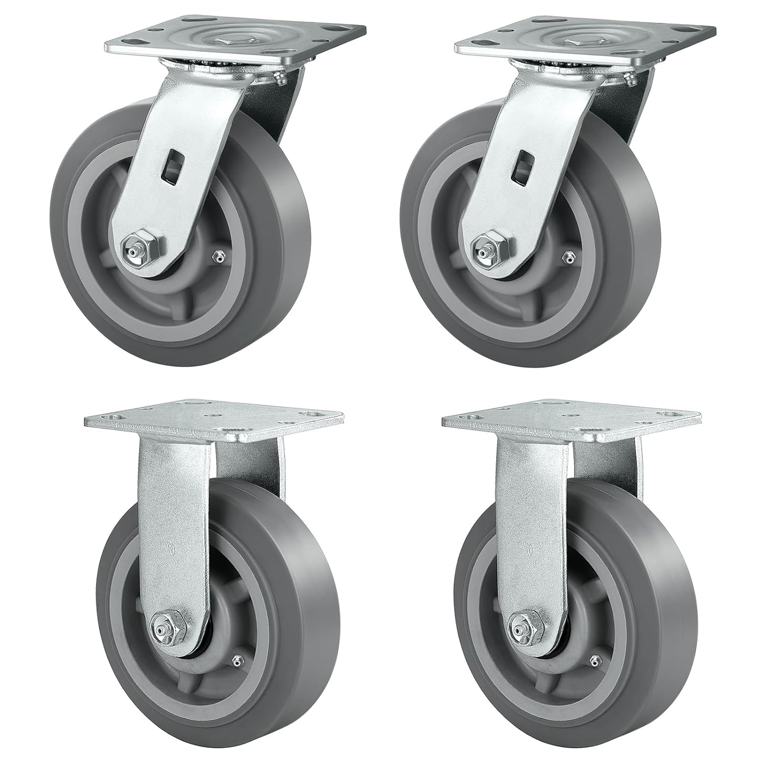 • 6" Rubber Casters: 2" width, 4x4-1/2 top plate, 7-1/2" total height, supports up to 1000 lbs per caster (4000 lbs for set of 4).
