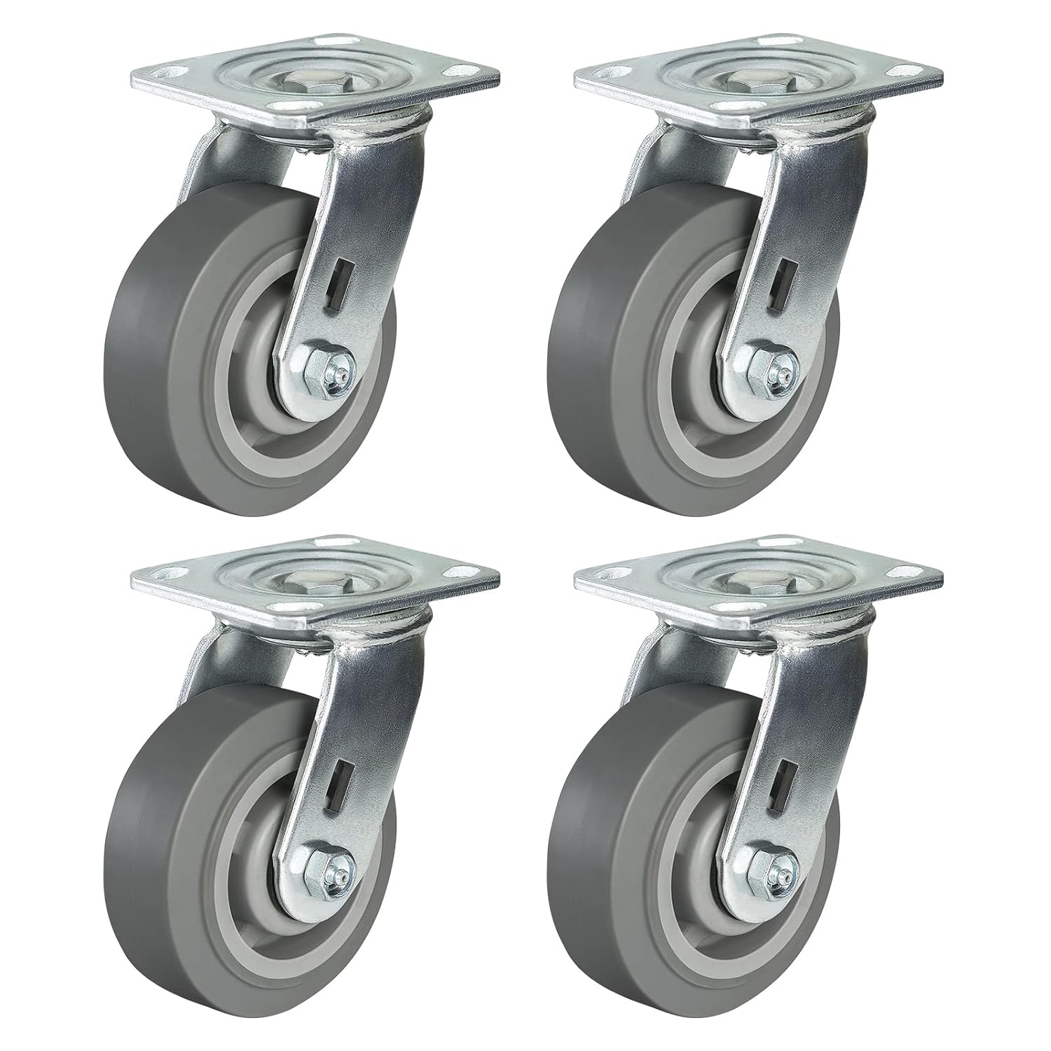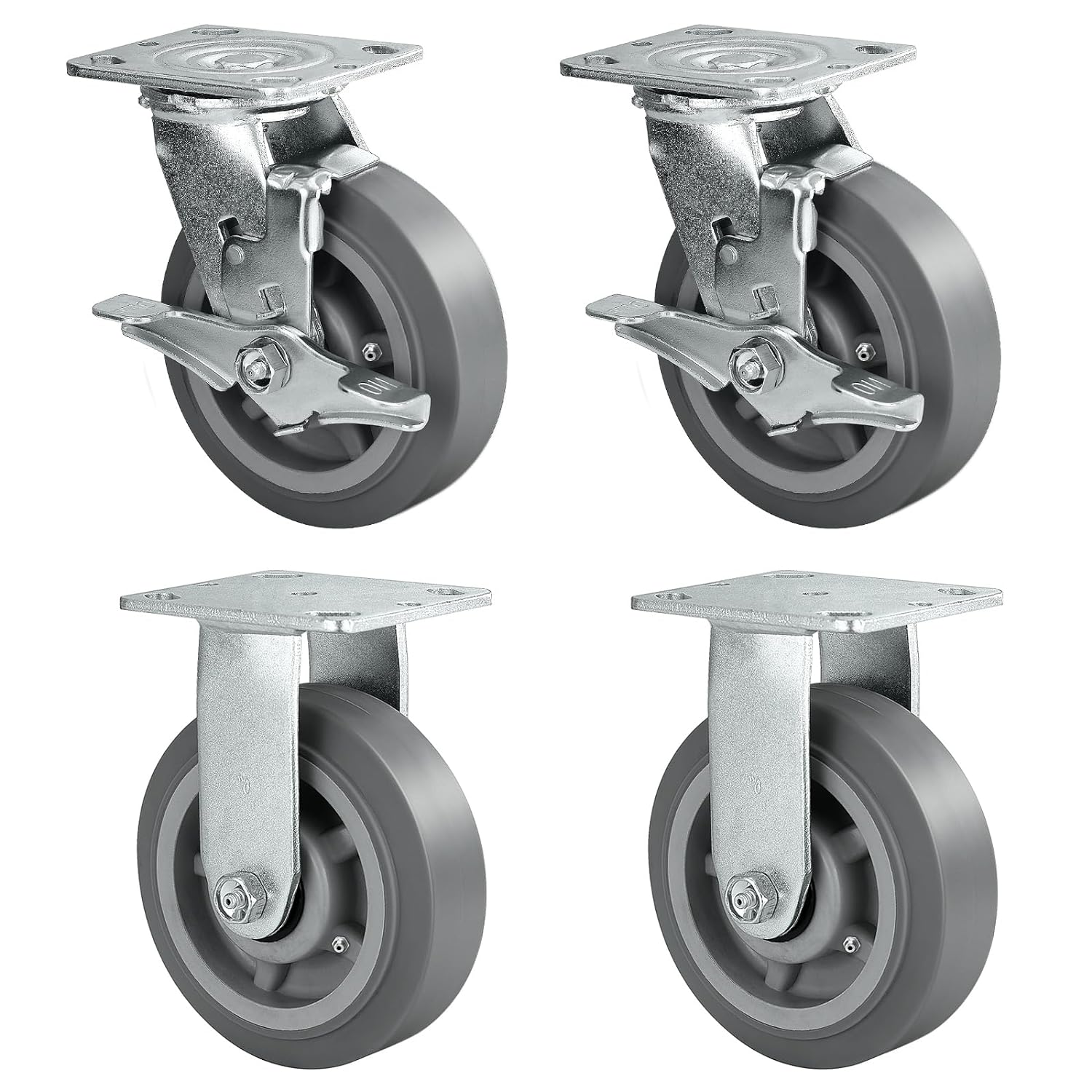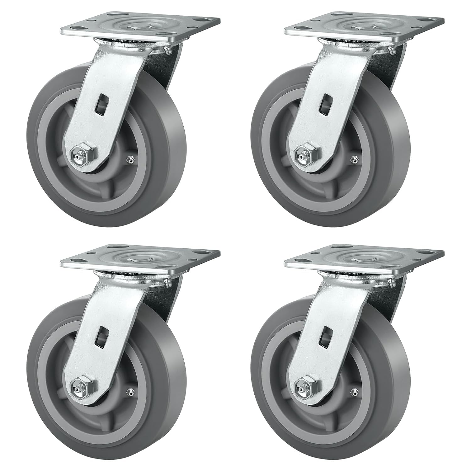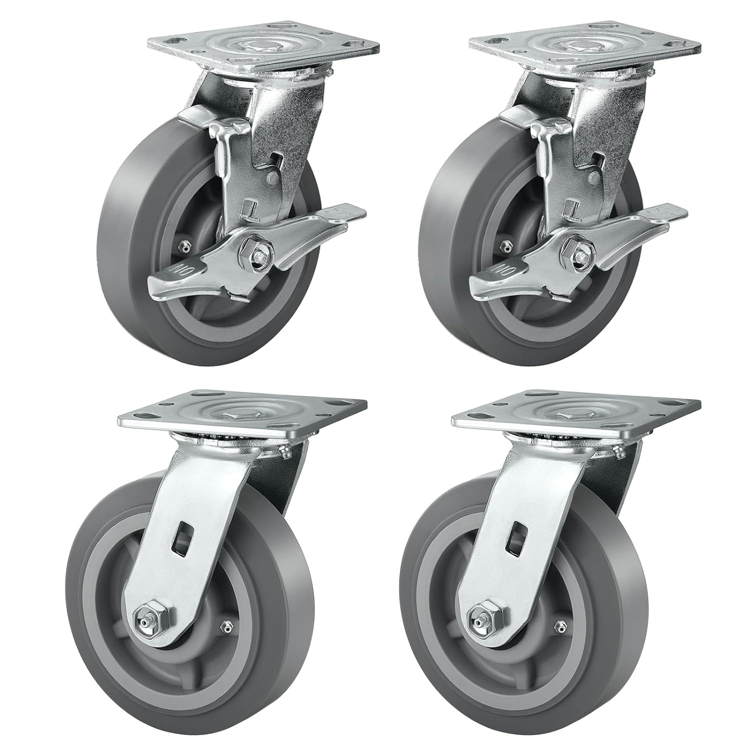• 5" Rubber Casters: 2" width, 4x4-1/2 top plate, 6-1/2" total height, supports up to 800 lbs per caster (3200 lbs for set of 4).