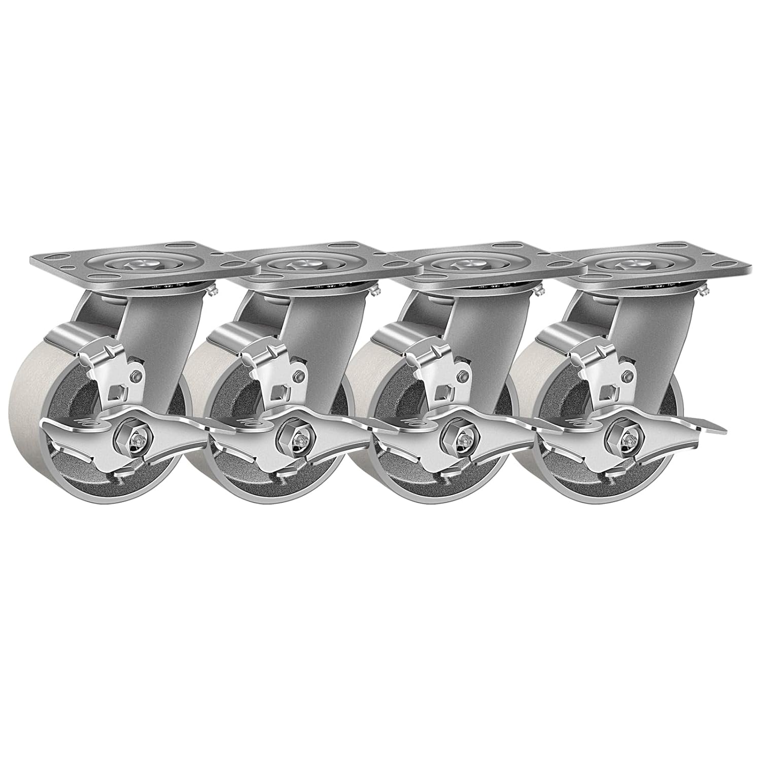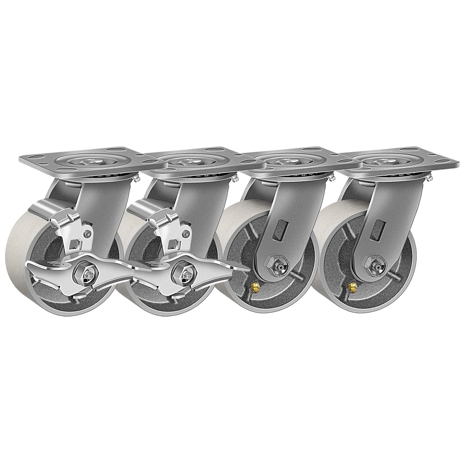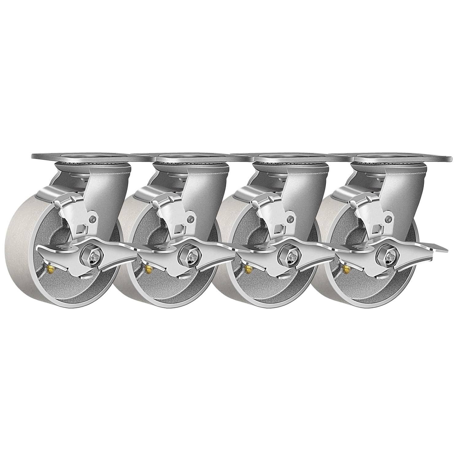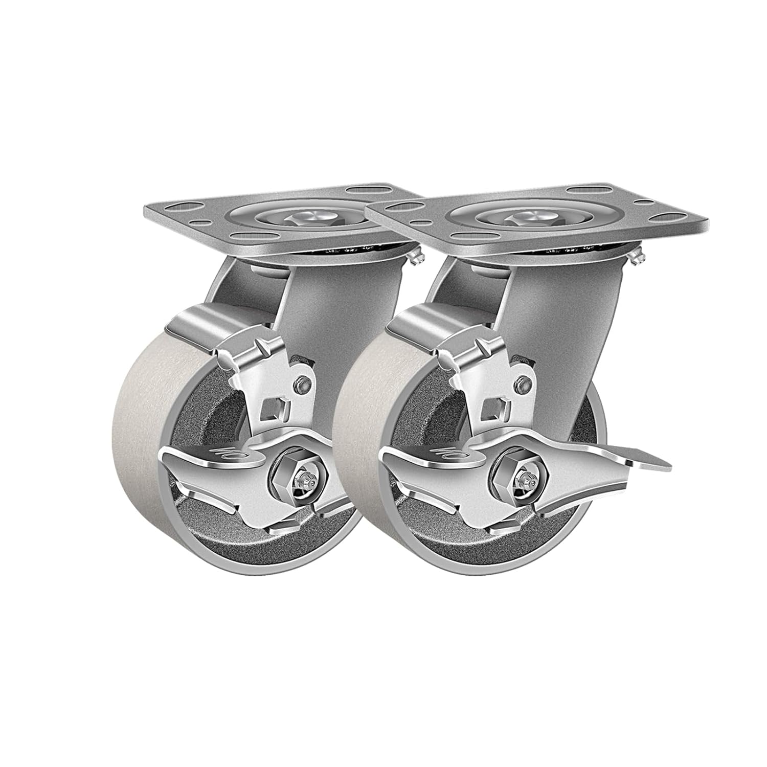 These casters are built for heavy-duty applications and feature roller bearings that rotate smoothly, along with a user-friendly design that includes options for brake, rigid, or swivel functionality. The design ensures quieter operation and excellent rolling performance.