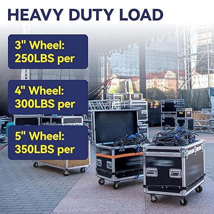 The 4-inch swivel casters allow for smooth and efficient 360-degree rotation, enabling equipment to move in any direction with minimal effort. With a total load capacity of 1,200 lbs, these casters provide reliable performance for various applications.