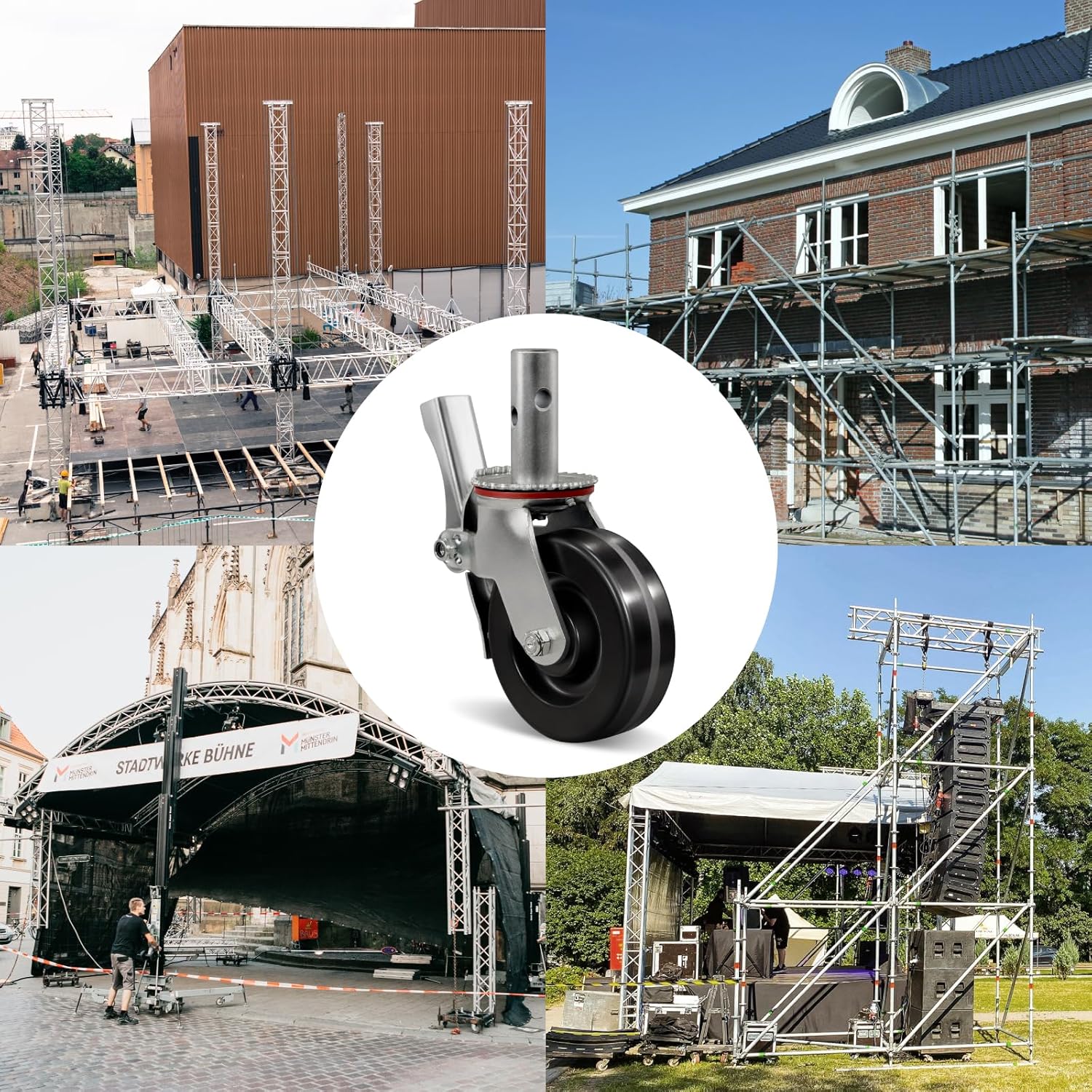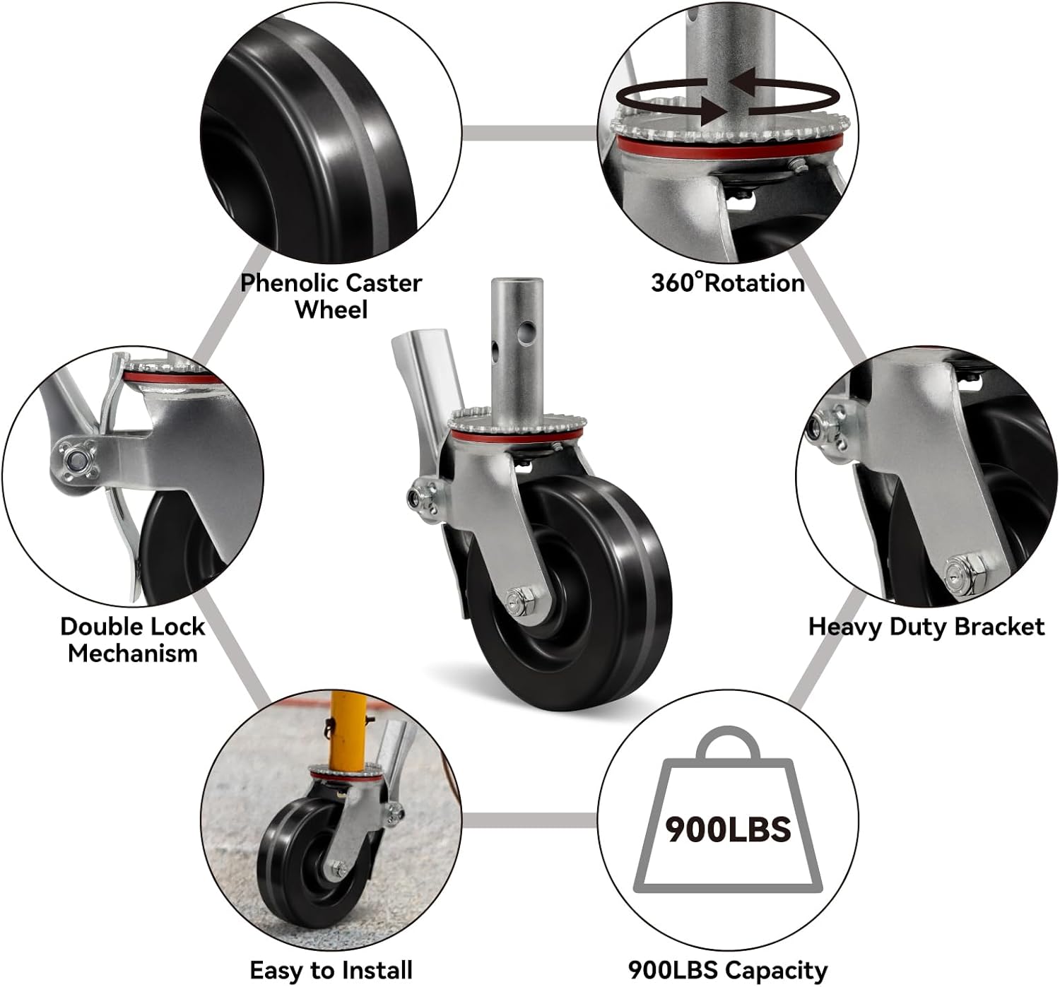 Heavy-Duty Load Capacity: Each scaffolding caster supports up to 900 lbs (3,600 lbs for a set of four). Compared to standard plastic or hard rubber wheels, these phenolic wheels offer superior longevity and impact resistance with the highest weight capacity in its class.
